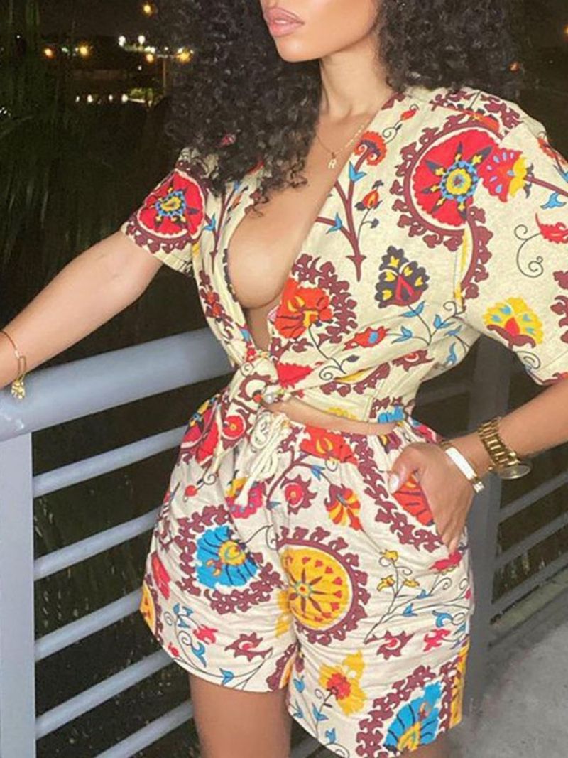 Afslappet Skjorte Med Blomster I To Dele Sæt Med Shorts Til Kvinder