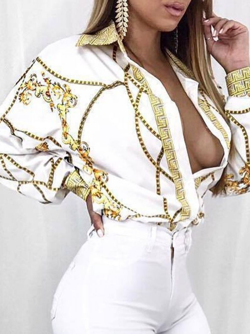 Almindelig Lapel Blomster Langærmet Standard Damebluse