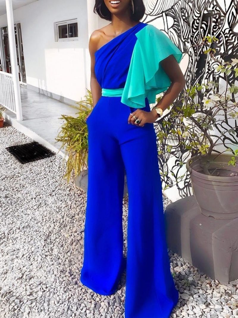 Fuld Længde Patchwork Color Block Slank Jumpsuit Med Høj Talje