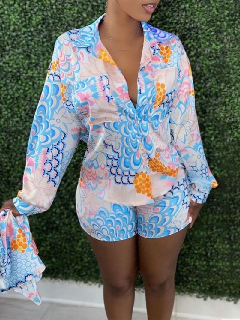 Knap Afslappet Skjorte Enkeltradet Todelt Sæt Dameshortssæt