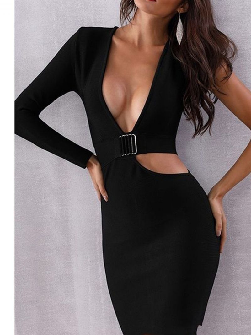 Lille Sort Kjole Langærmet Hul V-Hals Bodycon Sexet Kjole
