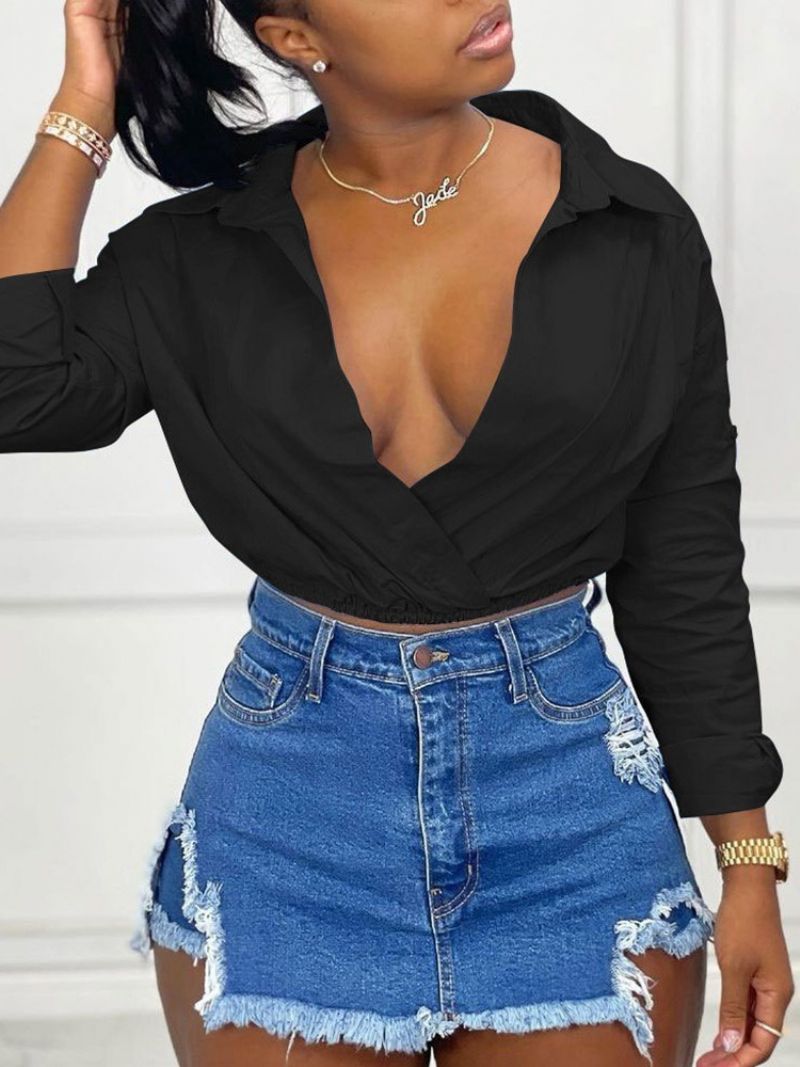 Plisseret Revers Almindelig Damebluse Med Lange Ærmer