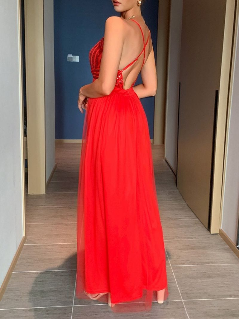 V-Hals Pailletter Gulvlængde Spaghetti Strop Høj Talje Kjole